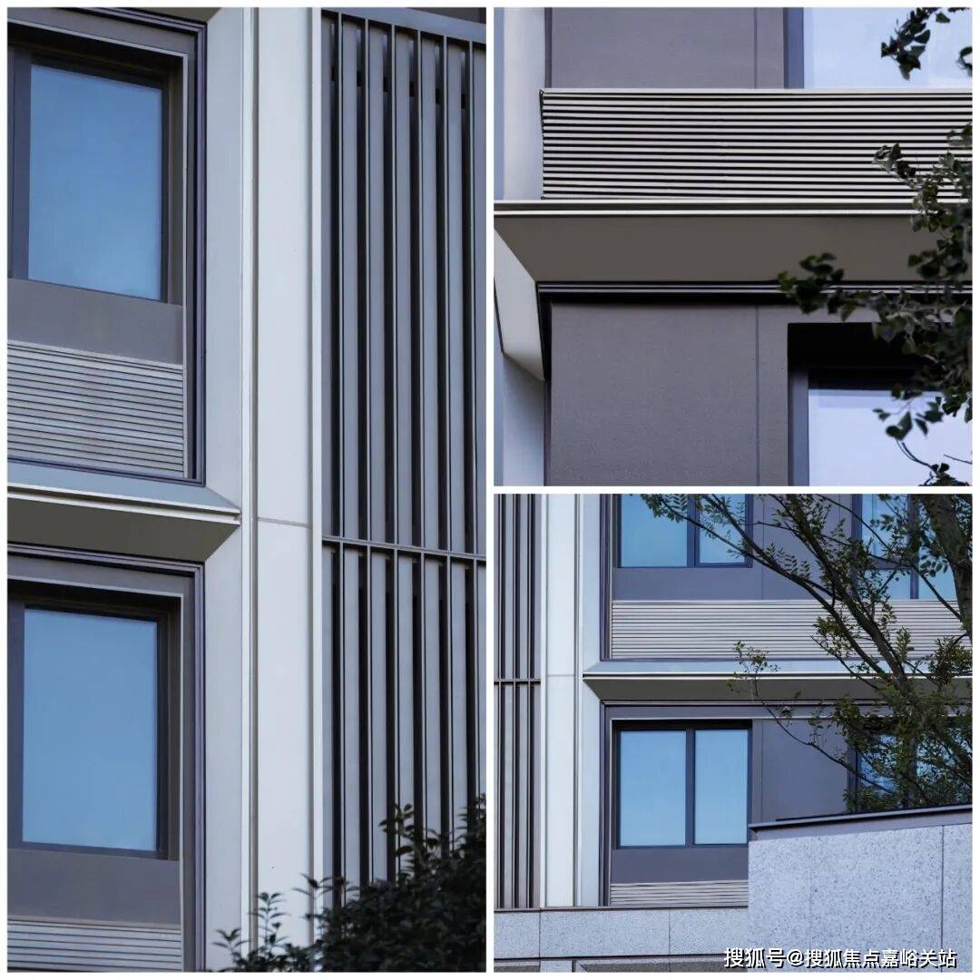 叠墅立面设计上,使用270°的幕墙与铝板呈现时代公建化高颜气质,超高成本的中式铝板披檐及基座与横向石材干挂传递东方审美。