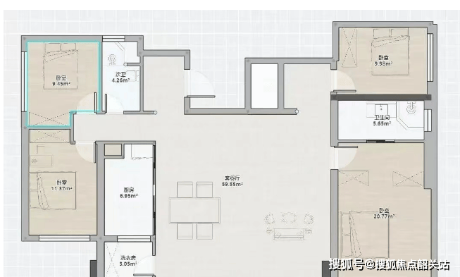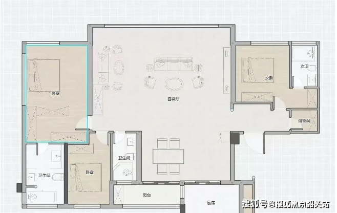 1. 建面约133㎡大平层:四房两厅两卫,适配刚需改善人群,户型布局合理,空间利用率高,得房率约120%。该户型采用四叶草+横厅设计,在广州市场独一无二,客厅无需打通,即可实现约7.4米大宽厅,媲美170㎡大平层的空间尺度,客厅连接超大景观阳台,阳台朝向江景,可欣赏到三江交汇的浩瀚风光,提升居住舒适度;四个卧室分布在户型四周,形成四叶草布局,互不干扰,保证每个卧室的私密性,主卧配备独立卫生间和衣帽间,空间宽敞,采光充足,次卧均配备飘窗,提升空间利用率和居住体验;厨房采用U型设计,操作空间充足,连接生活阳台,方便日常储物和晾晒,餐厅与客厅相连,形成通透的公共空间,适合家人聚餐和朋友聚会;该户型的特色的是,在有限的面积内,实现了大宽厅、四卧室的布局,同时兼顾采光和景观,性价比极高,适合三口之家或四口之家居住。
